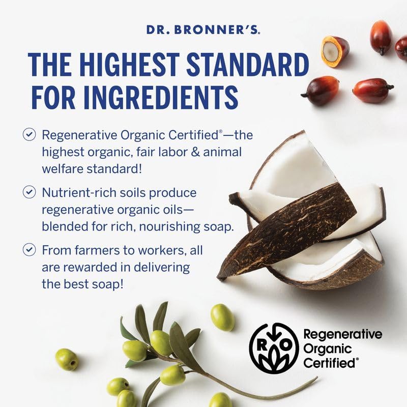 Dr. Bronner’s Peppermint Liquid Soap is scented with organic peppermint essential oil for a refreshing, clean feel that leaves skin feeling cool and awakens the senses. Made with a nourishing blend of Regenerative Organic Certified® oils, this true soap creates a rich, smooth lather that rinses clean—leaving skin feeling fresh and renewed. Great for everyday use, it’s crafted with ethically sourced, organic ingredients and contains no detergents, dyes, or added foaming agents. Vegan, made with organic oils, fair trade, and EWG Verified® for peace of mind—because caring for your body should also care for the planet!
